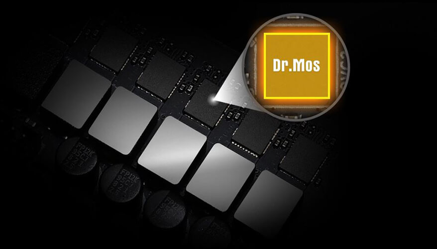 Dr.MOS – это интегрированная система питания, оптимизированная под синхронную подачу вольтажа для ресурсоёмких приложений! В сравнении с обычными дискретными транзисторами, Dr.MOS рассчитано подаёт высокий ток по каждой фазе, улучшая термальный результат и обеспечивая наивысшую производительность.