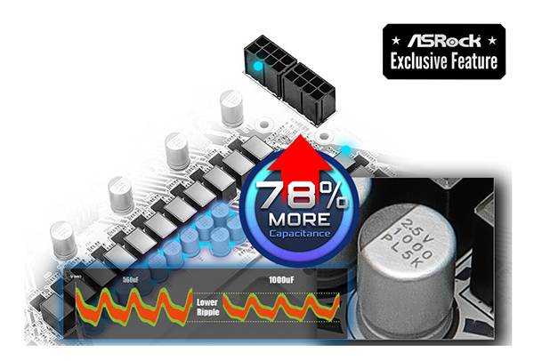 Разгон процессора требует более высокого тока, разъемы питания ASRock Hi-Density Power способны выдерживать ток выше традиционных 8-контактных разъемов CPU и 24-контактных разъемов ATX, обеспечивая более стабильную работу системы, а также снижая риск возгорания при интенсивном разгоне.