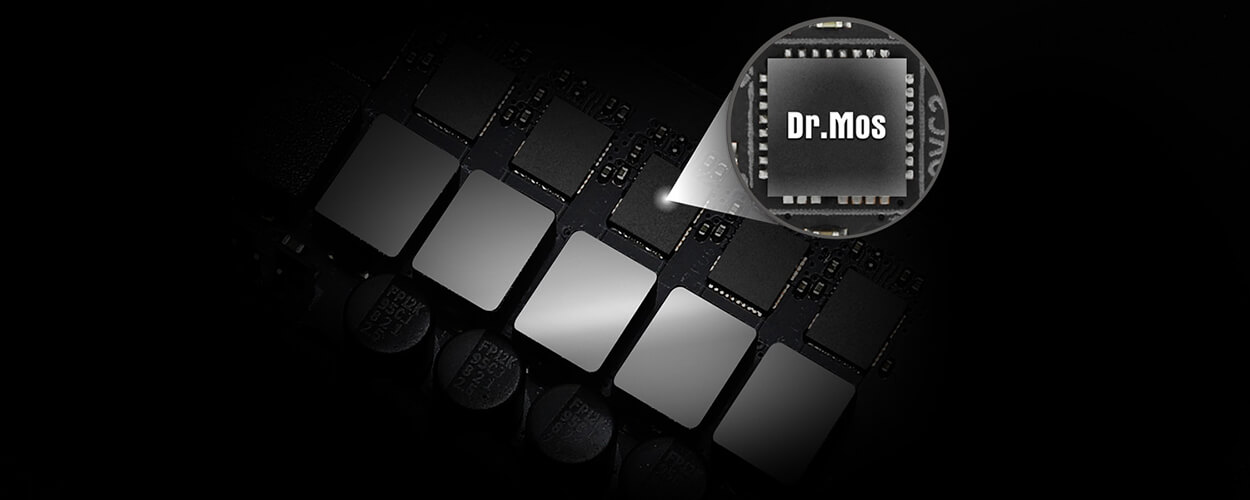 Dr.MOS – это интегрированная система питания, оптимизированная под синхронную подачу вольтажа для ресурсоёмких приложений! В сравнении с обычными дискретными транзисторами, Dr.MOS рассчитано подаёт высокий ток по каждой фазе, улучшая термальный результат и обеспечивая наивысшую производительность.