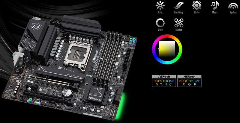 Здесь помимо встроенной подсветки имеются управляемые разъёмы RGB, которые позволяют подключать совместимое LED-оборудование, например, светодиодные ленты, вентиляторы и т.д. Также есть возможность синхронизировать работу устройств RGB LED через сертифицированные аксессуары Polychrome RGB для создания собственных уникальных световых эффектов.