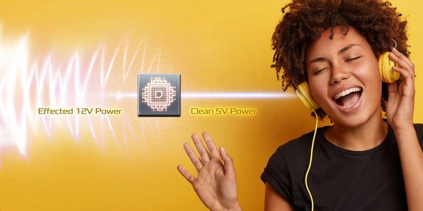 Плата оснащена отдельными преобразователями напряжения 5/12В, что исключает интерференцию и конфликты сигнала с другими 5-вольтовыми устройствами при высоких нагрузках.