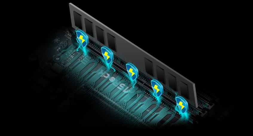 Усиленный слот DIMM закреплён по технологии поверхностного монтажа для большей механической прочности и более стабильного сигнала. Это передовое решение позволяет разгонять модули DRAM до запредельных частот.