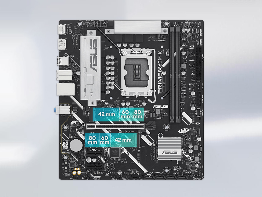 Стабильное питание имеет решающее значение для максимальной производительности процессоров Intel Core Ultra (серия 2). PRIME B860M-K имеет 6+1+1+1-фазную конструкцию с дискретными MOSFET, обеспечивающую эффективную и стабильную подачу питания для процессоров Intel и стабильную производительность при повседневном использовании.