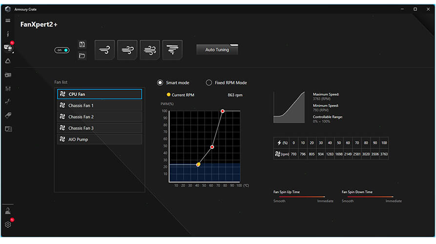 Пользователь получает контроль над работой вентиляторов с помощью утилиты Fan Xpert 2+. В режиме автоматический настройки все параметры работы системы охлаждения настраиваются одним щелчком мыши. При выборе тихого режима вентиляторы будут работать на невысокой скорости, чтобы минимизировать шум. Управлять работой системы охлаждения можно также с помощью интерфейса UEFI.
