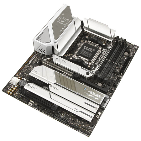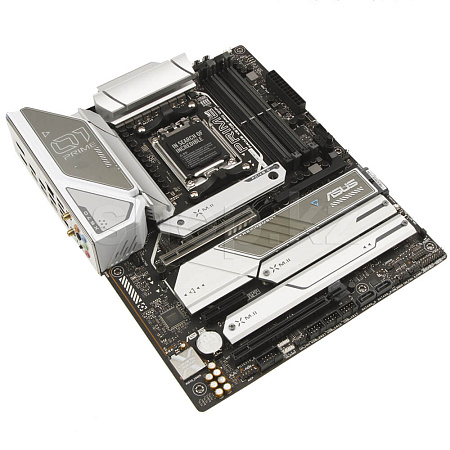 Prime X670E-Pro WiFi обладает футуристическим дизайном с серебристыми элементами, вдохновленными эстетикой космических кораблей.