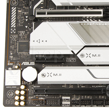 На силовых элементах, транзисторах и дросселях, находятся два массивных радиатора с термопрокладками. Их размер существенно увеличен по сравнению с теми, что применялись на материнских платах серии X570.