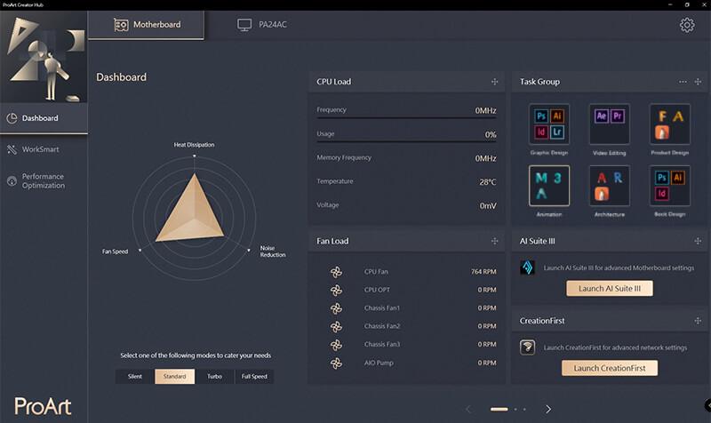 В дружественном интерфейсе приложения ProArt Creator Hub содержатся средства мониторинга и управления всеми включенными в компьютерную систему устройствами серии ProArt, в том числе материнской платой и монитором.