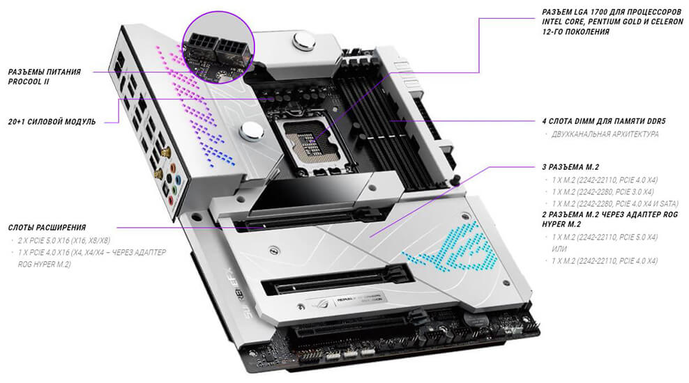 ROG Maximus. Белоснежная «броня», гибко персонализируемая адресуемая подсветка, гибридный ватерблок ek для системы питания – все это дает максимальную свободу выбора для сборки уникального компьютера. Достоинства платы не ограничиваются эстетикой. Ее технические возможности нацелены в будущее, ведь она поддерживает и шину PCIe Gen 5.0, и новейшую память DDR5.