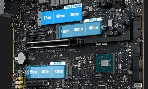 ROG Maximus Z790 Apex Encore оснащена тремя встроенными слотами M.2, один из которых поддерживает PCIe 5.0 и обеспечивает взрывную скорость 16 ГБ/с, в то время как остальные предлагают все еще впечатляющие 8 ГБ/с по интерфейсу PCIe 4.0.