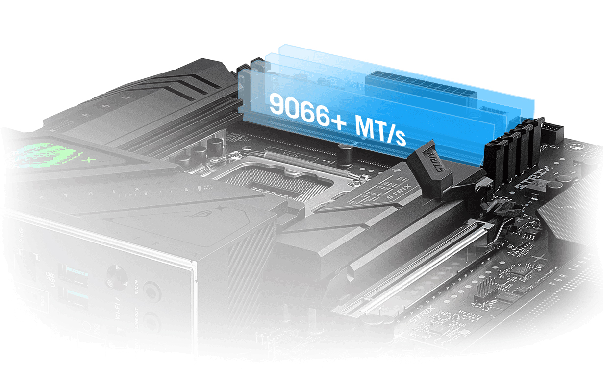 ROG ең жоғары өнімділікпен жадты қамтамасыз етудің бай тарихына ие және DDR5 ерекшелік емес. Жақсартылған сигналды бағыттау энтузиастардың жиынтықтарына Strix B860-F-де 9 ГТ/с шегінен асып, болашақта одан да жоғары жылдамдыққа жетуге мүмкіндік береді. Қуатты пайдаланушылар үшін UEFI дәл баптауға және өнімділікті арттыруға арналған көптеген нұсқаларды ұсынады.