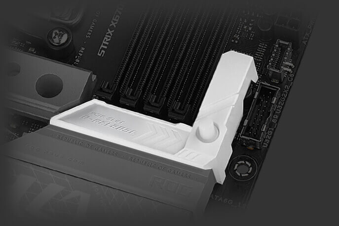 Физическая кнопка разблокирует защитную защелку первого слота PCIe простым нажатием, значительно упрощая процесс извлечения карты PCIe из материнской платы, когда приходит время перейти на новый графический процессор или дополнительную карту.