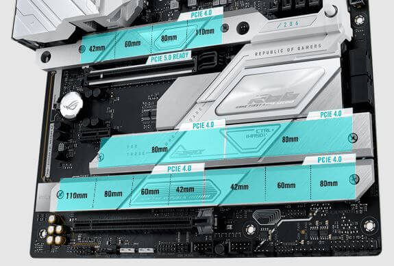 Верхний слот PCIe 5.0 x16 SafeSlot хорошо оснащен для увеличения размера и пропускной способности графических карт нового поколения. Возможности быстрого хранения данных представлены четырьмя слотами PCIe 4.0 M.2, каждый из которых оснащен надежным радиатором для максимальной производительности.