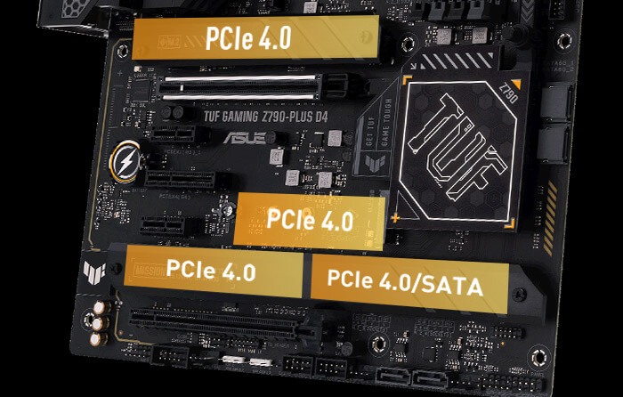 Четыре слота PCIe 4.0 M.2 поддерживают до двух устройств 22110, а также обеспечивают поддержку NVMe SSD RAID для невероятного потенциала производительности. Создайте конфигурацию RAID с использованием до четырех устройств хранения данных PCIe 4.0, чтобы насладиться высочайшей скоростью передачи данных.