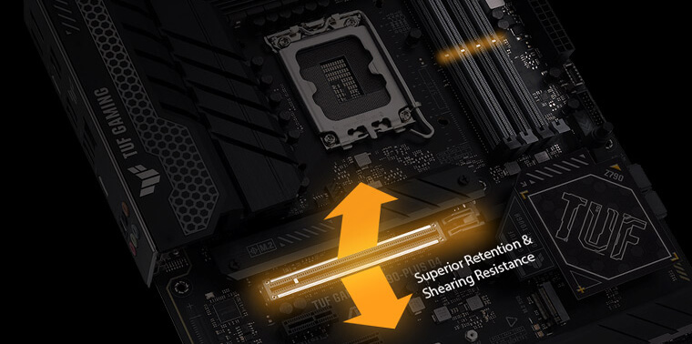 SafeSlot - это усиленная металлическая оболочка, устанавливаемая в слот PCIe для надежной фиксации карты. Поскольку PCIe 5.0 в два раза быстрее, чем PCIe 4.0, ASUS усовершенствовала процессы SMT-производства для создания более быстрого SafeSlot - все для того, чтобы обеспечить пользователям максимально возможную скорость передачи данных. Кроме того, для поддержки и защиты модулей памяти на некоторых материнских платах ASUS добавлена оболочка ASUS SafeDIMM, позволяющая вставлять модули быстро, точно и уверенно.