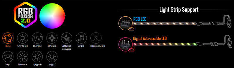 Благодаря обилию настроек пользователи могут организовать подсветку ПК сообразно свои представлениям о стиле. Полноценная поддержка технологии светодиодной RGB-подсветки и адаптированное фирменное приложение RGB Fusion 2.0 – это полный контроль, простота управления и синхронизация зональной подсветки в составе материнской плате.