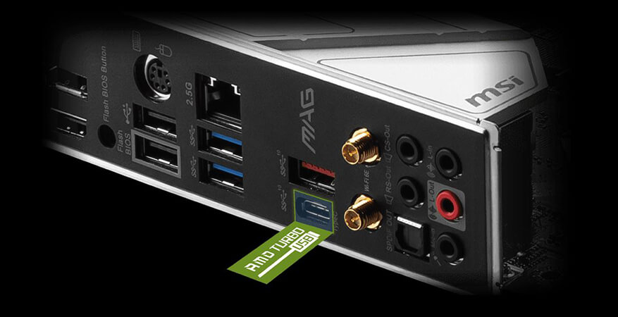 Высокоскоростные порты USB 3.2 Gen2, реализованные на материнских платах MSI серии MAG в виде разъемов USB 3.2 Gen 2 Type-A и Type-C, обладают пропускной способностью до 10 Гбит/с. Передавайте файлы по интерфейсу USB быстрее, чем когда-либо раньше!