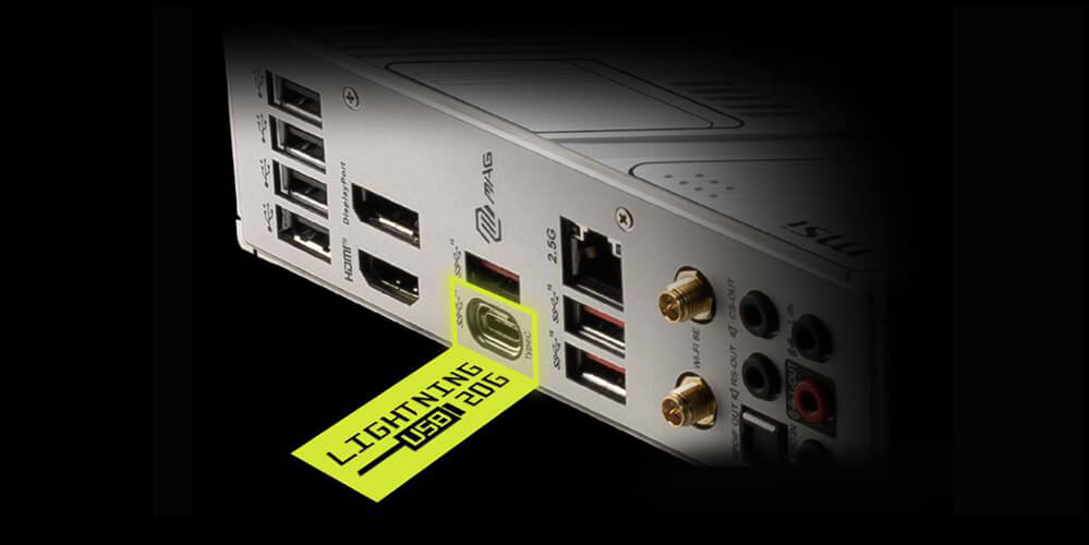 Используя контроллер Lightning USB 3.2 Gen2x2, материнские платы MSI серии MAG B760 обеспечивают высокоскоростной обмен данными с тыловым портом USB Type-C , пропускная способность которого составляет 20 Гбит/с!