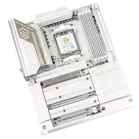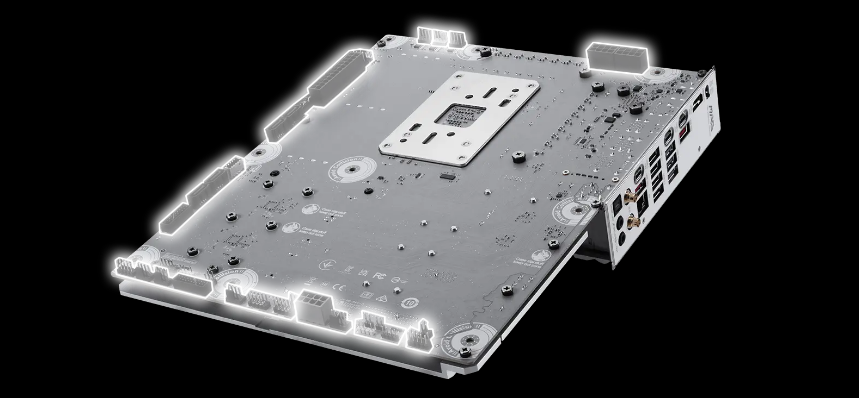Материнская плата MAG X870E TOMAHAWK MAX WIFI PZ имеет конструкцию с задним подключением, в которой контакты питания материнской платы, питания процессора, вентилятора, SATA и других интерфейсов перенесены на заднюю сторону платы. Это упрощает прокладку кабелей, а также обеспечивает более аккуратный и эстетичный внешний вид системы.