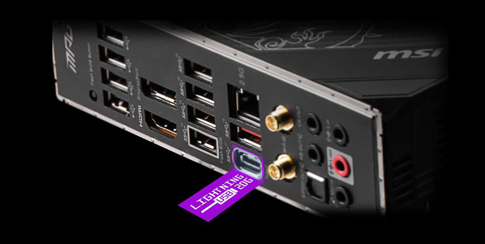 Используя контроллер Lightning USB 3.2 Gen2x2, материнские платы MSI серии MPG Z690 обеспечивают высокоскоростной обмен данными с тыловым портом USB Type-C, пропускная способность которого составляет 20 Гбит/с.
