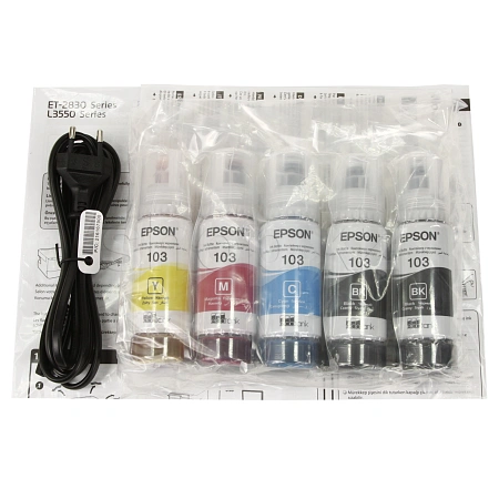 Комплект поставки: документация, кабель питания, дополнительный картридж с черными чернилами, 4 картриджа с чернилами