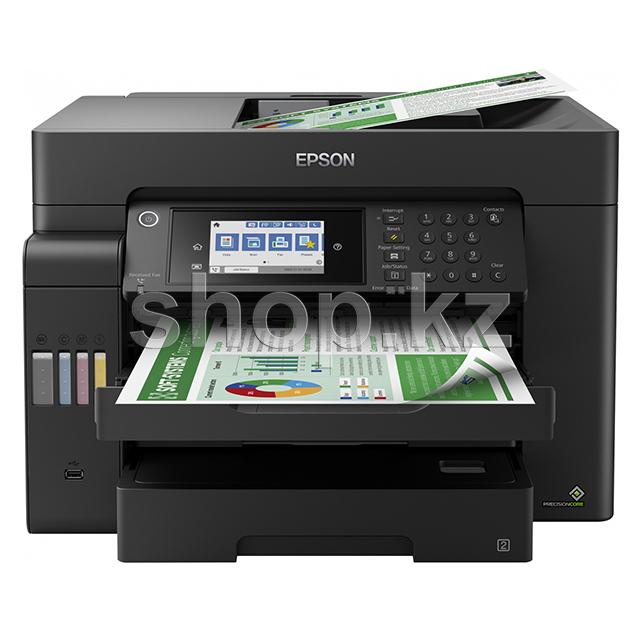 Особенность всех устройств серии «Фабрика печати Epson» – это печать без картриджей. Вместо картриджей в Epson L15150 использует фронтальные чернильные емкости. Фронтальное расположение позволяет проще отслеживать уровень чернил, а также делает устройство более компактным.