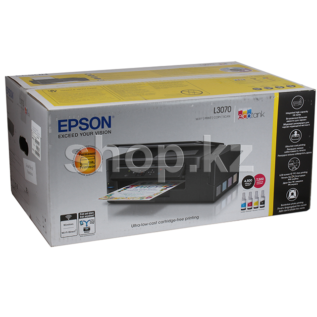 Epson L3070 - это МФУ 3 в 1 (принтер, сканер и копир), нового поколения. Эта модель использует для печати компактные, полностью интегрированные в корпус, чернильные емкости вместо картриджей, что обеспечивает существенную экономию как денег, так и рабочего пространства. Отличительной чертой Epson L3070 служат возможность беспроводной работы с мобильных устройств на базе iOS и Android. с помощью сервиса Epson Connect, а также печать напрямую с карт памяти, благодаря специальному слоту и ЖК-экрану диагональю 3.7 см.