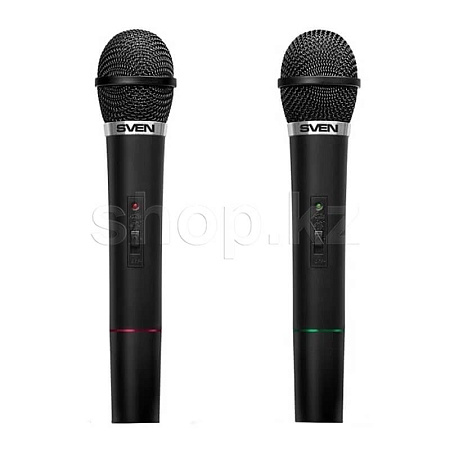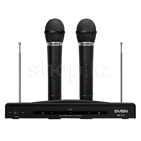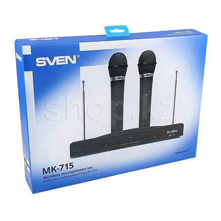 Для подключения микрофонов используется беспроводной радиопередатчик с дальностью действия 30 м (ресивер с антенной). Микрофоны выполнены в прочном пластиковом корпусе и оснащены кнопкой отключения на рукоятке. Автономная работа микрофонов SVEN MK-715 осуществляется за счет использования батареек 6F22.
