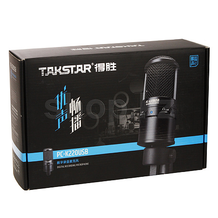 Takstar PC-K220USB – USB-стереомикрофон, отличающийся добротной сборкой, качественным звучанием и простотой эксплуатации. В отличие от ряда микрофонов схожей стоимости, оснащен регуляторами гейна и уровня громкости наушников. Поставляется в комплекте с поп-фильтром, USB-кабелем и аккуратной стойкой-триподом.