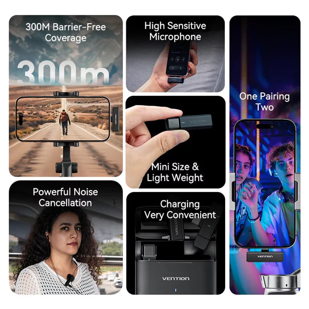 Vention NCAB0 — комплект из двух беспроводных петличных микрофонов с зарядным кейсом, предназначенный для записи звука на устройства с портом USB-C (смартфоны, планшеты, ноутбуки). Это компактная система для видеоблогеров, интервью, стримов и записи подкастов.
