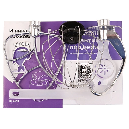 Крюк для теста идеален для замешивания густого теста. Венчик для взбивания подойдёт для взбивания яичных белков, сливок, замешивания жидкого теста. Насадка для перемешивания идеальна для смешивания негустых ингредиентов.
