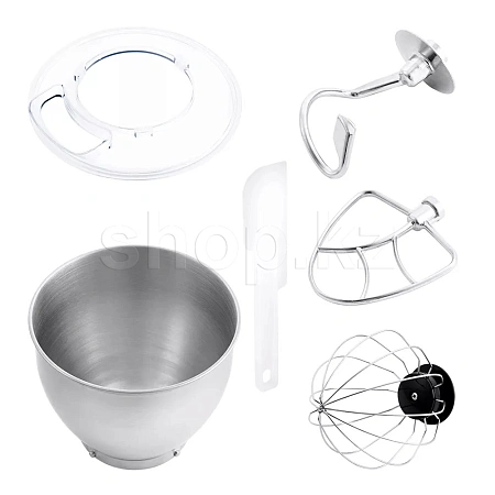 Миксер оснащён вместительной чашей 7 л. Форма насадок и чаши подобраны так, что при любом количестве продуктов насадка не оставляет их по краям не перемешанными.