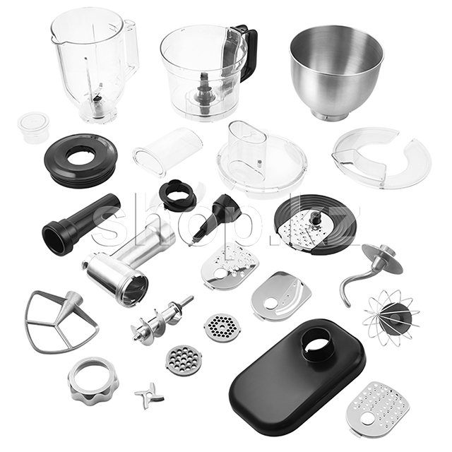В комплекте идут венчик для взбивания, насадка для смешивания, насадка для замеса теста, мясорубка, комбайн и блендер