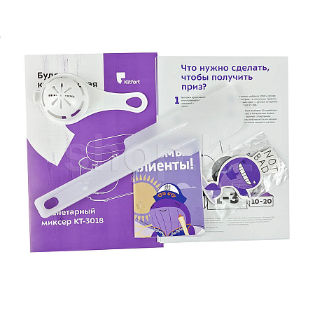 В комплекте с планетарным миксером, помимо насадок, чаши и крышки на чашу, идут сепаратор для яиц и лопатка для ручного смешивания и вычищения остатков из чаши.