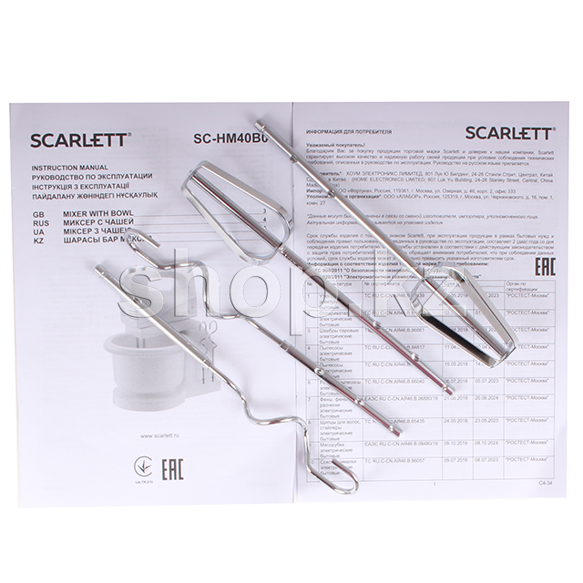 Миксер с чашей Scarlett SC-HM40B03 мощностью 500 Вт работает в 5 скоростях. Прибор позволяет взбивать коктейли и муссы, качественно замешивать тесто. С его помощью можно за пару минут приготовить нежное суфле, взбить яичные белки или молочные сливки до густой, нежной пены.