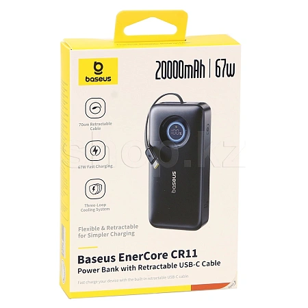 Внешний аккумулятор с высокой мощностью зарядки до 67W, встроенным втягивающимся USB-C кабелем и цифровым дисплеем. Подходит для смартфонов, планшетов и другой техники с зарядкой по USB-C.