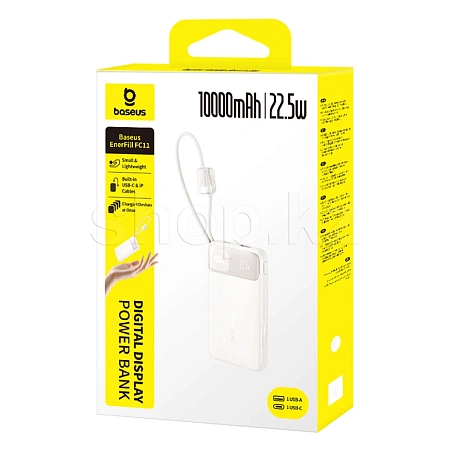 Компактный внешний аккумулятор ёмкостью 10000 mAh с поддержкой быстрой зарядки до 22.5 W. Оснащён двумя встроенными кабелями USB-C и Lightning, а также портами USB-A и USB-C, что позволяет заряжать до 4 устройств одновременно.
