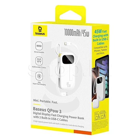 Компактный внешний аккумулятор Baseus серии EnerFill QPow 3 с ёмкостью 10000 mAh и поддержкой быстрой зарядки до 45W. Главная фишка – 2 встроенных кабеля USB-C и цифровой дисплей, чтобы заряжать устройства без поиска проводов и постоянно видеть остаток заряда.