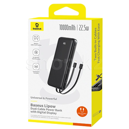 Внешний аккумулятор ёмкостью 10000 mAh с поддержкой быстрой зарядки до 22.5 W. Оснащён двумя встроенными кабелями (USB-C и Lightning), цифровым дисплеем уровня заряда и поддерживает одновременную зарядку нескольких устройств без использования дополнительных проводов.