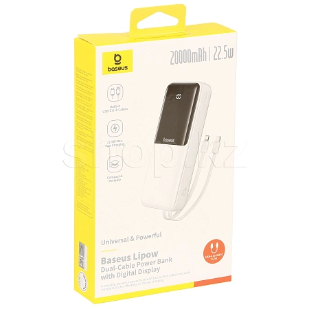 Внешний аккумулятор ёмкостью 20000 mAh с поддержкой быстрой зарядки до 22.5 W. Оснащён двумя встроенными кабелями (USB-C и Lightning), цифровым дисплеем уровня заряда и поддерживает одновременную зарядку нескольких устройств без использования дополнительных проводов.
