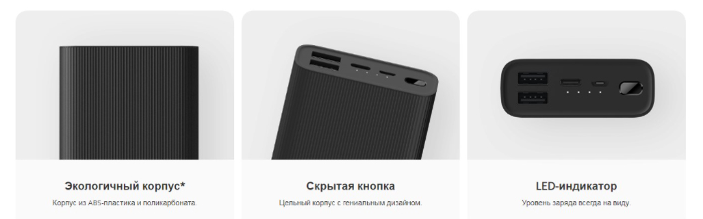 Кроме двух стандартных портов USB-A у внешнего аккумулятора Xiaomi есть один порт USB-C, что позволяет одновременно заряжать от него три разных устройства.