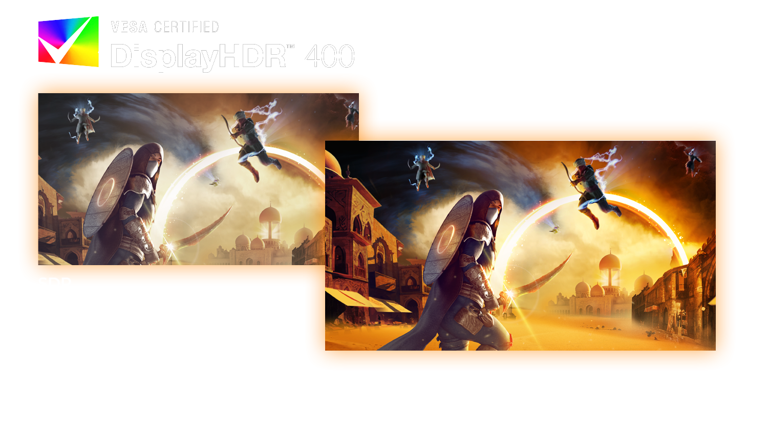 Сертифицированный VESA DisplayHDR 400 обеспечивает значительный шаг вперед по сравнению с обычными дисплеями SDR. В отличие от других экранов, совместимых с HDR, настоящий DisplayHDR 400 обеспечивает потрясающую яркость, контрастность и максимальную цветовую яркость до 400 нит; изображения оживают благодаря заметным бликам и более глубокому и нюансированному черному цвету.