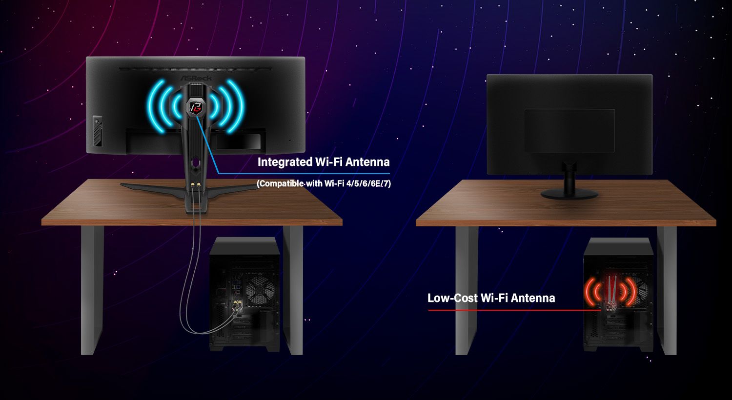 Монитор Phantom Gaming оснащён технологией устранения мерцания "Flicker-Free", которая устраняет мерцание, снижает нагрузку на глаза и обеспечивает комфортный просмотр изображения. Монитор Phantom Gaming имеет встроенную Wi-Fi антенну, чтобы сигнал Wi-Fi не перекрывался столом. Подключите антенну Wi-Fi к монитору и играйте без задержек сигнала!