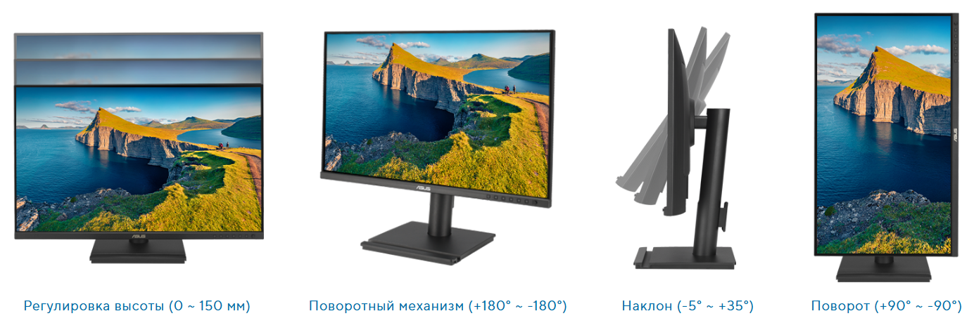 Көлбеу, айналу, айналу және биіктікті икемді реттеу ең ыңғайлы көру орнын табуды жеңілдетеді. Сондай-ақ, экранды портреттік бағытқа 90° бұруға болады, бұл ұзақ құжаттармен жұмыс істеуге, код жазуға немесе веб-сайттарды қарауға өте ыңғайлы.