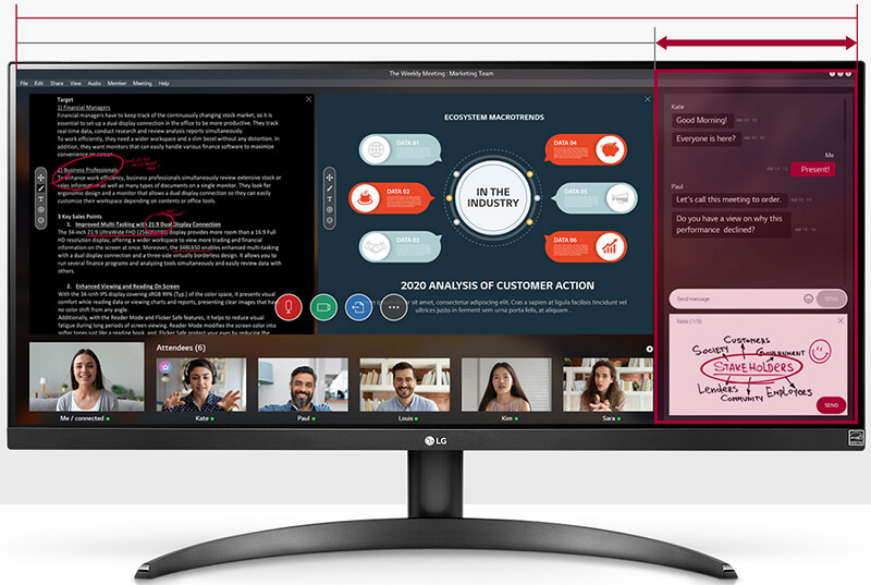 Разрешение UltraWide Full HD (2560x1080) предполагает на 33% больше места на экране по ширине, чем дисплей с разрешением FHD (1920x1080), обеспечивая соотношение сторон 21: 9.