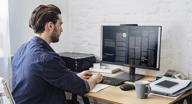 Благодаря встроенной камере с высоким разрешением, моноблок ExpertCenter E5 AiO 24 отлично подходит для проведения видеоконференций.