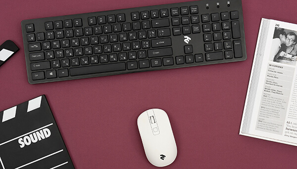 Полноразмерная беспроводная мышка с белым софт-тач покрытием и корпусом симметричной формы.