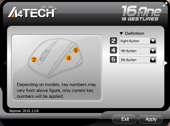 Для A4Tech FStyler FG30S предусмотрено фирменное ПО под названием “Gesture 16-in-1 Software”. Оно позволяет настроить поведение трех из шести клавиш мыши — правой кнопки и боковых. Для правой кнопки мыши доступна “Функция 16-в-1”. Это набор жестов, которые будут выполнять определенные функции. На 4 и 5 кнопки можно назначить выполнение различных действий.