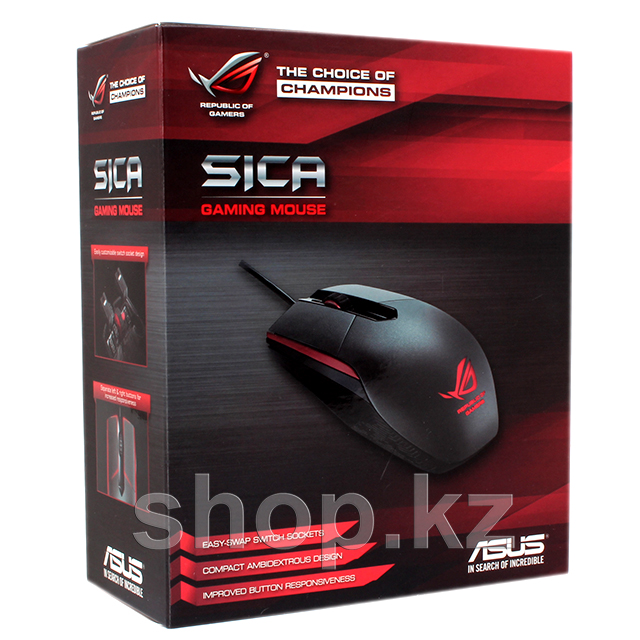 Asus ROG Sica имеет только две независимые кнопки с высоким уровнем тактильной отдачи и чувствительности, а также колесо прокрутки. Она рассчитана на хват кончиками пальцев. Рельефный рисунок на боках мыши обеспечивает надежный контакт с пальцами. Мышь оборудована улучшенными переключателями Omron, которые рассчитаны на 20 млн нажатий, и которые можно заменить для настройки силы нажатия. Мышь симметричной формы подходит для использования как левой, так и правой рукой. Устройство украшено логотипом с красной подсветкой.