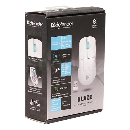 Ультралегкая игровая мышь с тремя режимами подключения: проводное, беспроводное по радиоканалу 2.4 Ггц, беспроводное подключение по Bluetooth. Сенсор мыши поддерживает высокое разрешение до 26 000 dpi. Также в модели предусмотрены тефлоновые ножки для быстрого скольжения, встроенный аккумулятор на 400 мАч и 2 боковые кнопки, которые могут быть запрограммированы под любые задачи.
