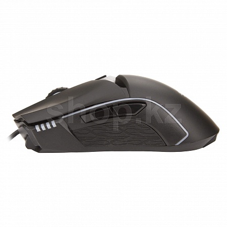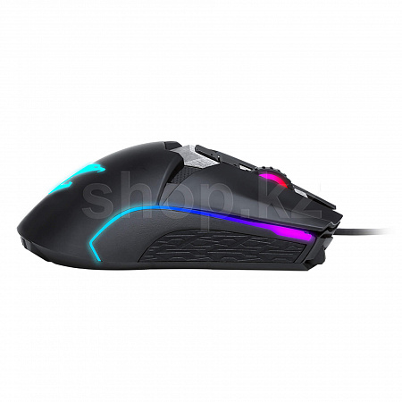 У компьютерной мыши эффектный агрессивный дизайн со светодиодной подсветкой, которая синхронизируется с другими устройствами той же линейки производителя. Мышь рассчитана на охват правой рукой, по бокам есть прорезиненные антискользящие вставки.